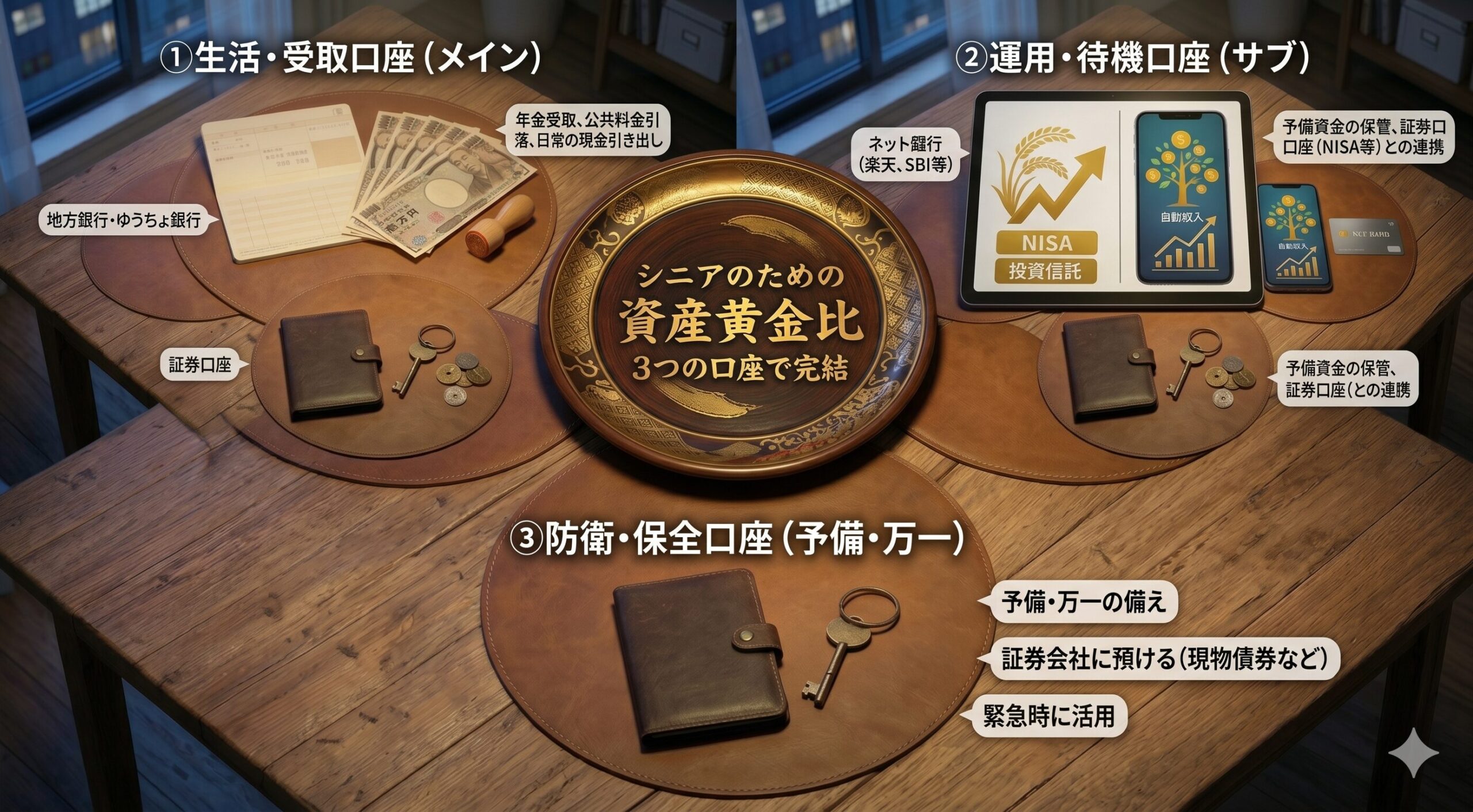 | ① 生活・受取口座 (メイン) | 地方銀行・ゆうちょ銀行 | 年金受取、公共料金引落、日常の現金引き出し |