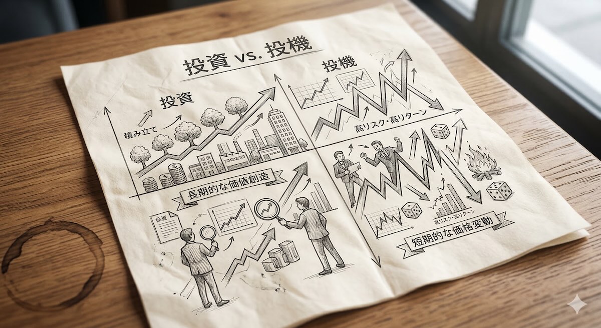 一方、投機は、「相場の変動(チャンス)に賭けて、短期的な利益を狙うこと」。イメージから先にいえば、波の変化を読み、一瞬のタイミングを逃さずに乗る「サーフィン」や、勝負事に近い性質を持っています。 利益が得られるしくみは、資産そのものの価値よりも、「安く買って、高く売る」という価格の差(値ざや)に注目するため、文字通り「機会を投じる」行為になります。投機では誰かの得が誰かの損になる、プラス・マイナス・ゼロの「ゼロサム・ゲーム」の側面が強く、市場の波を上手く捉える技術や運が求められるため、ギャンブル性が強く現れます。
